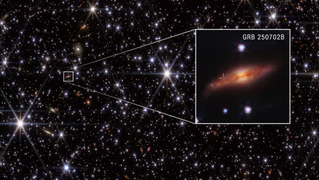 On October 5, NASA’s James Webb Space Telescope provided astronomers with the sharpest image ever obtained of the host galaxy of the gamma-ray burst GRB 250702B. This galaxy is so distant that its light takes about 8 billion years to reach us. The burst appears within a field of stars in the very dense central plane of our Milky Way galaxy. In the enlarged image, lines indicate the burst’s position near the upper edge of the galaxy’s dark dust lane. This location rules out the possibility that the burst is linked to the supermassive black hole at the galaxy’s core. The complete infrared image is about 2.1 arcminutes in diameter. © NASA, ESA, CSA, H. Sears (Rutgers). Image processing: A. Pagan (STScI)