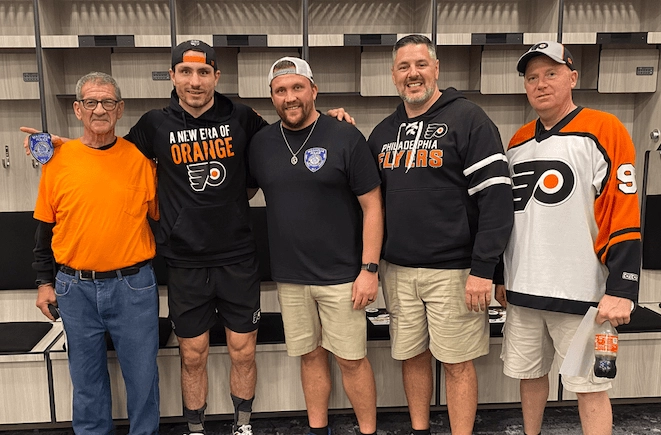 This year, he partnered with Dogfish Head brewery to create a limited edition IPA, Engine 19, whose sales will go to his namesake charity. Of course, the beer is Flyers orange.