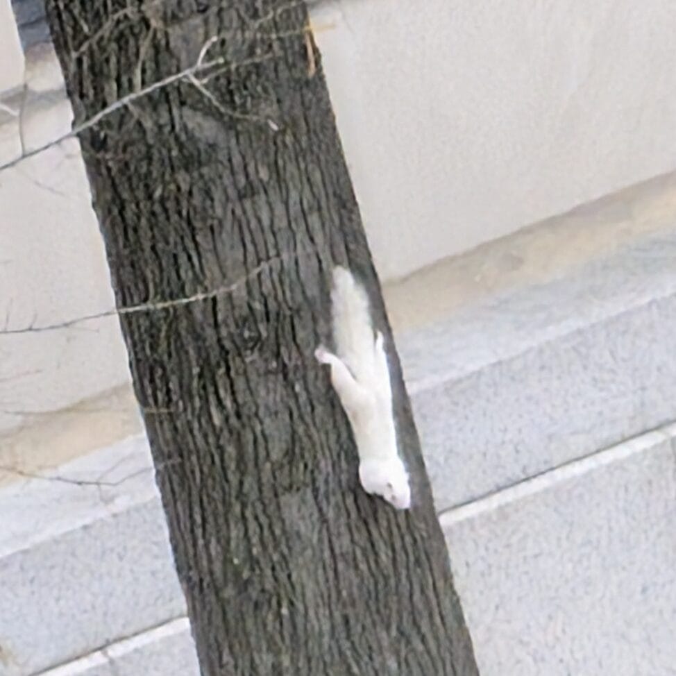With that said, white squirrels are just another color variant of this very variable species. The most common sightings of white squirrels are of isolated individuals with a completely white coat but dark eyes, a condition known as leucistic. This variant appears to spring up sporadically all over the species’ range and then dies out, only to pop up again somewhere else (see list of colonies and sighting). I think these are spontaneous mutants of some gene that delegates the use of the pigment (melanin) gene, not mutants of the melanin gene itself ( possible mechanism is suggested below). Instead of being produced in skin/hair cells and the eyes, it is only produced in the eyes. In another mutation, one in the genes that are directly responsible for producing melanin, no cells make the pigment and the squirrel is not only white but has pink or blue eyes. These true “albinos” are reported even less commonly, probably because without the eye pigment to reduce glare, their vision is impaired and they may suffer more from falls. Increased predation may also be a factor; a decline in the well monitored Olney Illinois albino population has been linked to cats.