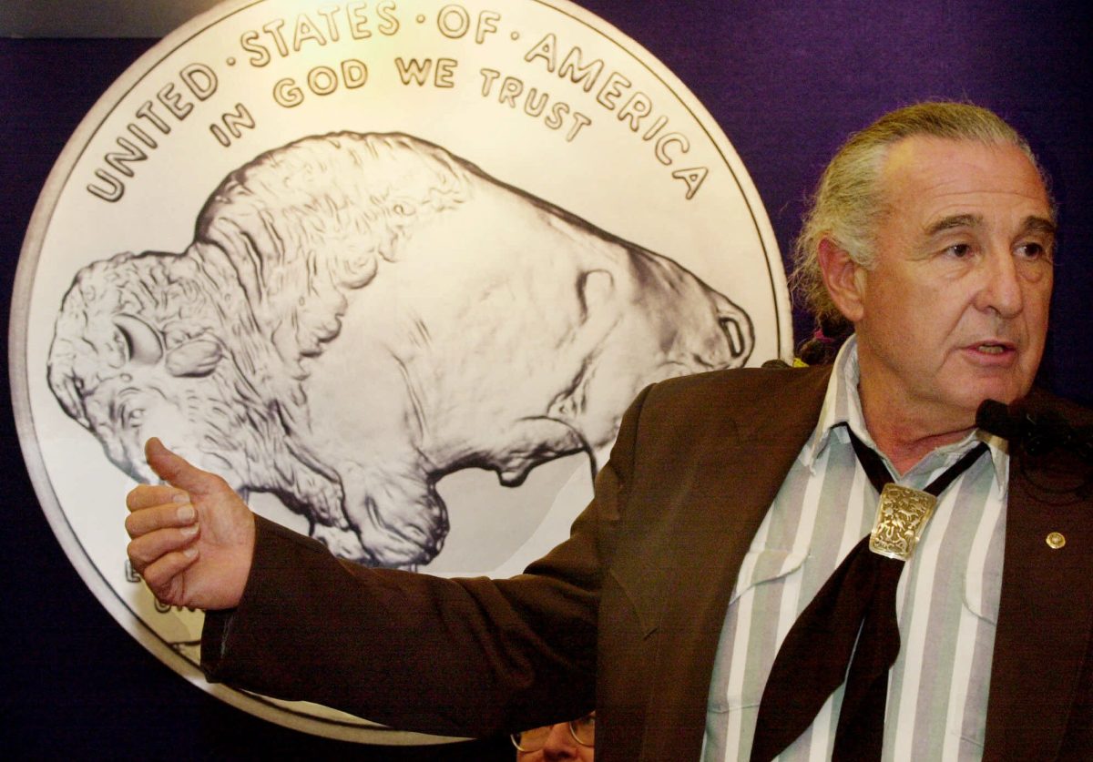 Sen. Ben Nighthorse Campbell, D-Colo., stands in front of an enlargement of the new American Buffalo Commemorative silver dollar that was struck, during ceremonies at the Denver Mint Friday, May 4, 2001. The new coin will not be available to the public until June. (AP Photo/Ed Andrieski)