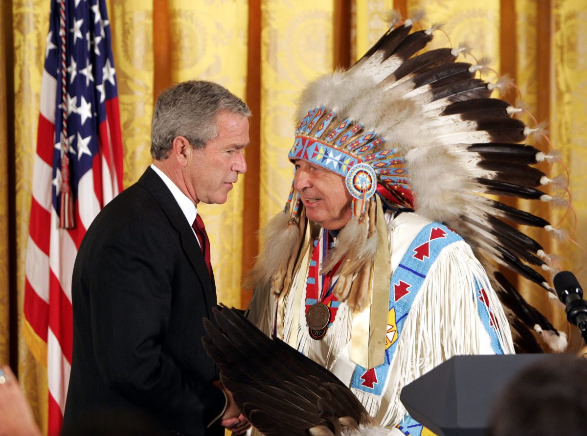 President Bush, left, shakes hands with Sen. Ben Nighthorse Campbell, R-Colo., who is wearing his native northern Cheyenne dress, during a ceremony in the East Room of the White House Thursday, Sept. 23, 2004. President Bush on Thursday marked the opening of the new American Indian National Museum, saying it will serve as a powerful reminder of the spirit and vitality of peoples native to the nation. (AP Photo/Charles Dharapak)
