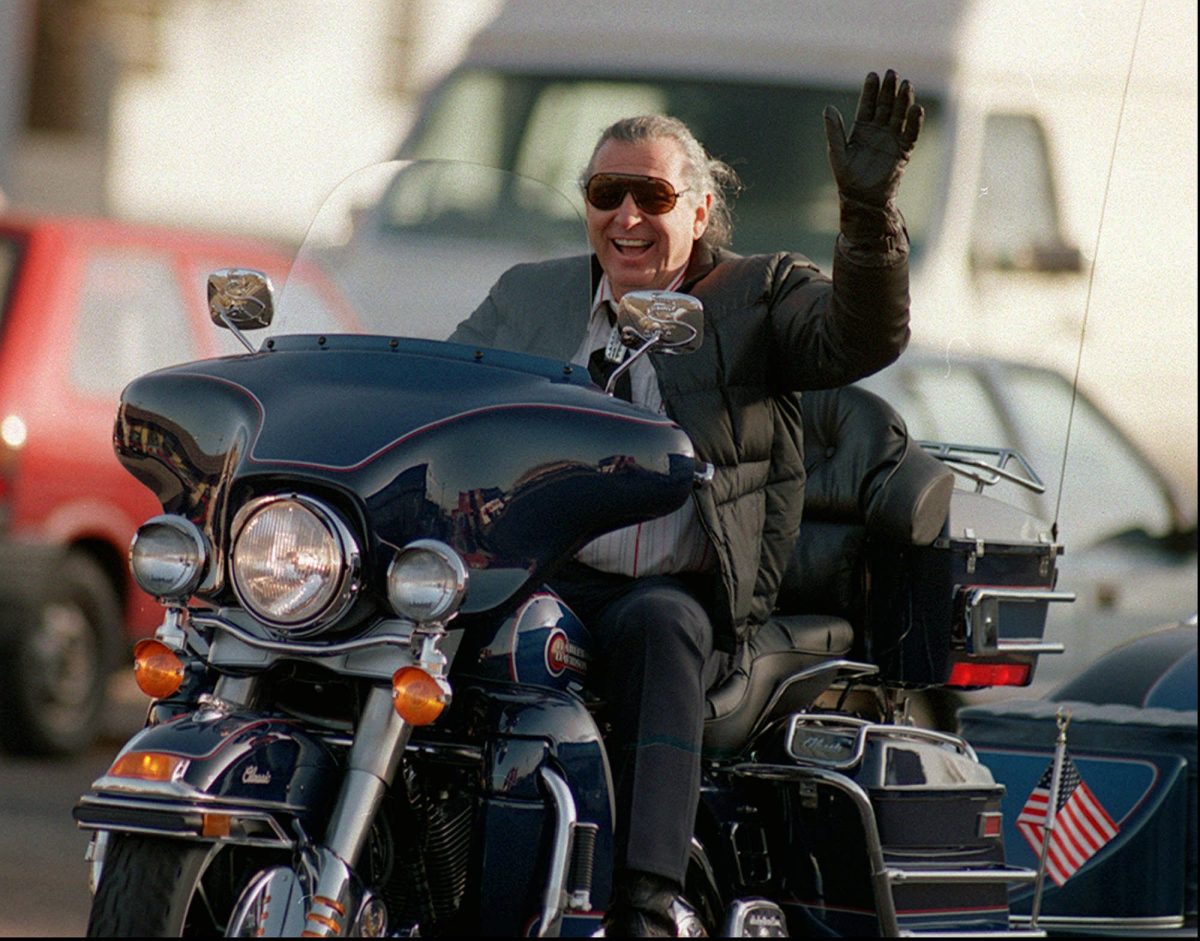 Colorado U.S. Sen. Ben Nighthorse Campbell waves after picking up a new Harley-Davidson motorcycle in November 1992 in Denver. (AP Photo/Denver Post, John Epperson)