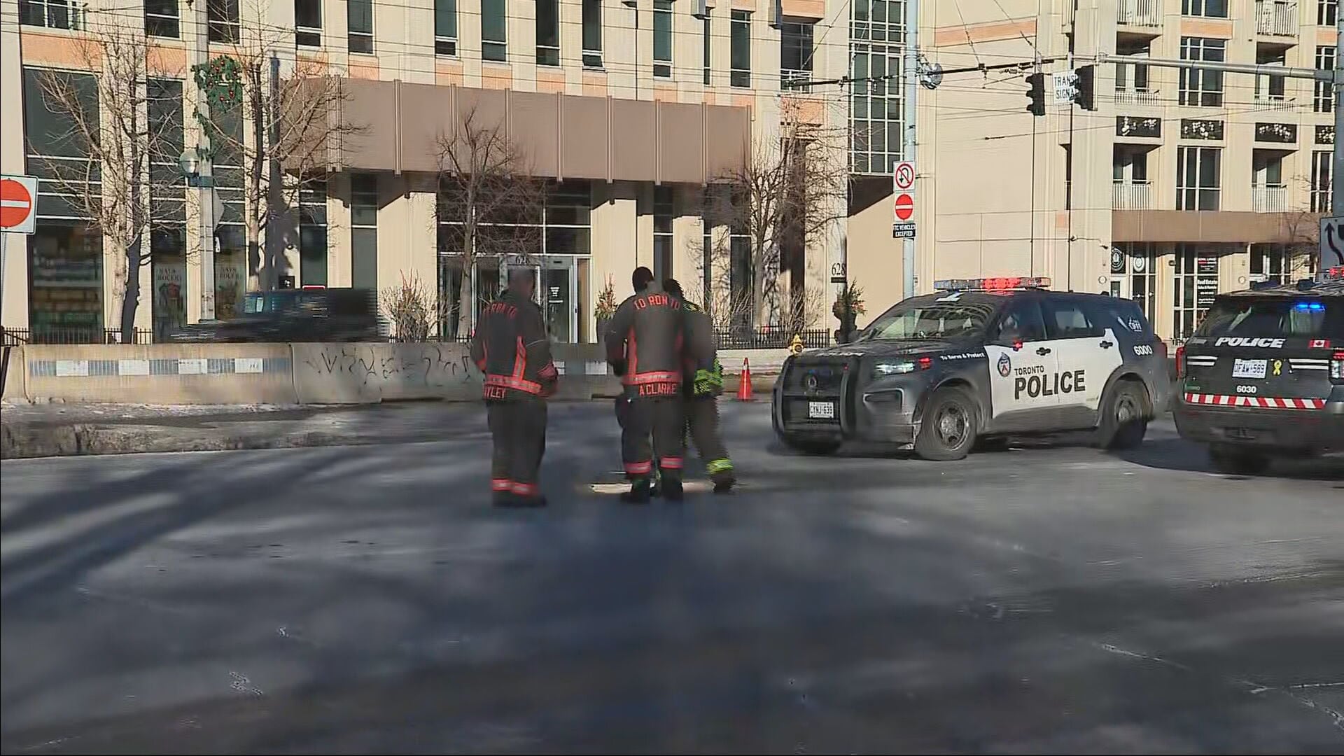 Toronto police and fire crews on the scene after a vehicle struck a dog and a pedestrian on Jan. 2, 2026. (CP24)