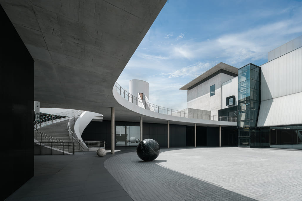 A central 14,000-square-foot courtyard anchors the museum and connects interior galleries with outdoor sculpture areas. The courtyard also provides access to ancillary spaces, including a bistro and a flexible programme venue housed in a separate structure across the open landscape.