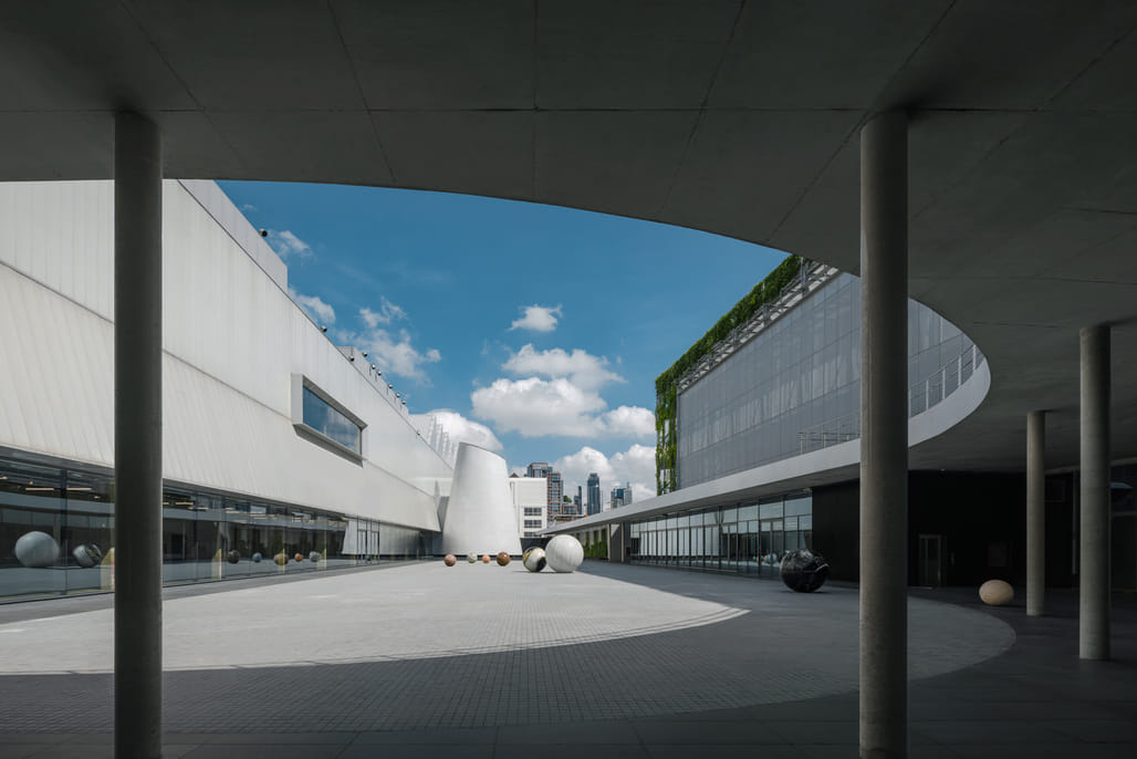 Among the building’s more distinctive architectural elements is the “Chapel,” a cone-shaped gallery clad in porcelain mosaic tiles, which reinterprets traditional Thai temple ornamentation. The chapel is set within a shallow reflection pool that is intersected by a vehicular ramp leading to underground parking.