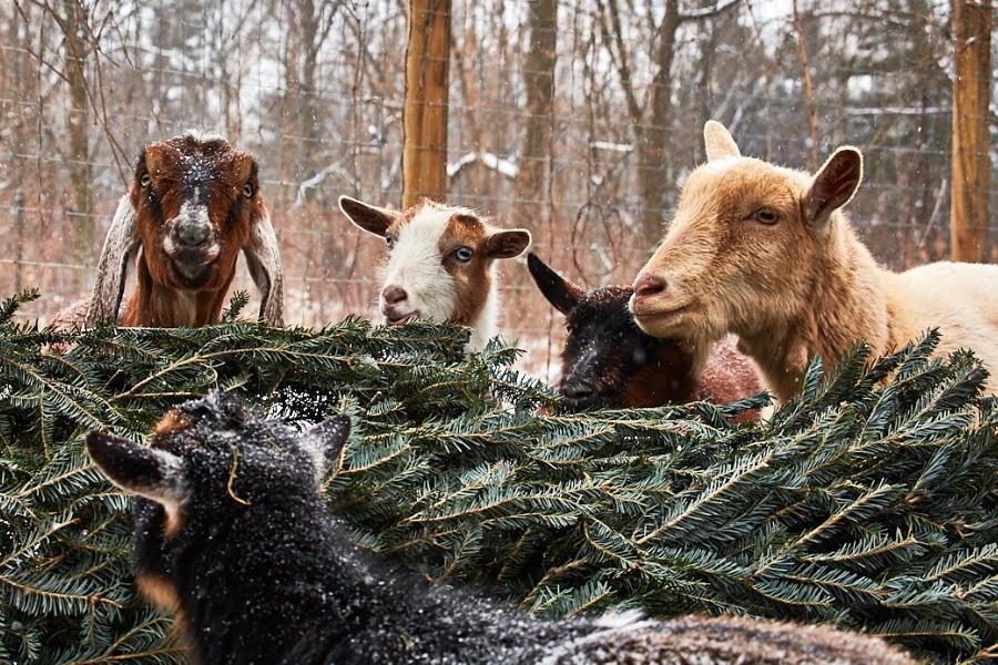 Instead of throwing out your Christmas tree, donate it to Philly Goat Project, whose goats will merrily chow down on the branches. / Photograph by Jerome Eno.