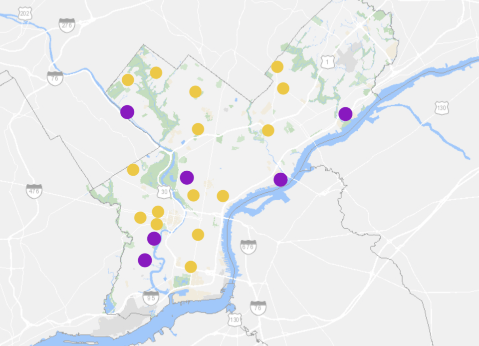 The City of Philadelphia’s temporary Christmas tree recycling sites (yellow) and Sanitation Centers (purple), mapped. / Image courtesy of the City of Philadelphia