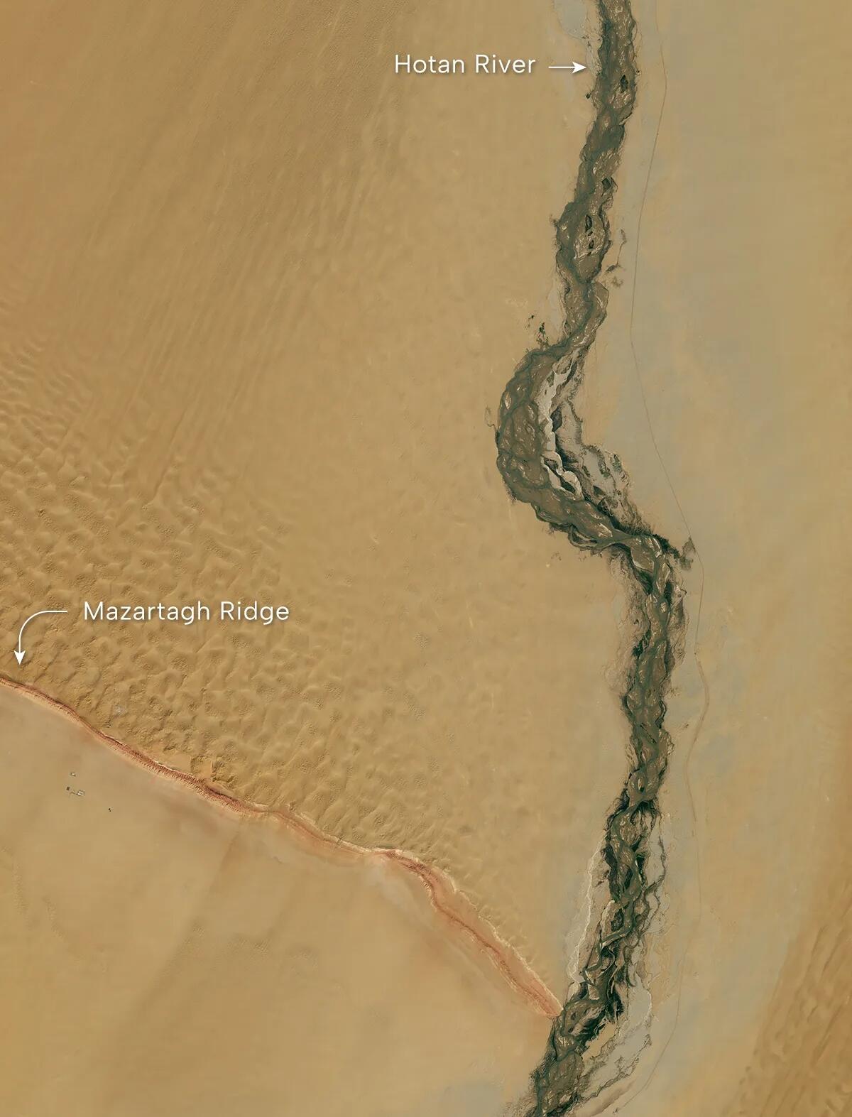 This Landsat 9 image from September 11, 2025, reveals a striking geological boundary in China’s Tarim Basin where the Mazartagh ridge meets the Hotan River. The 145 km (90 mile) ridge acts as a natural barrier, creating distinct dune patterns on either side.