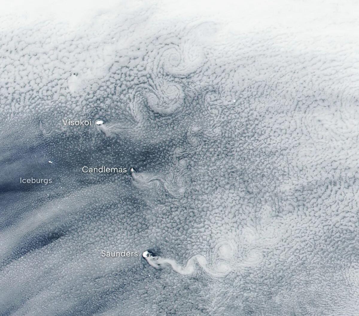 This NOAA-20 VIIRS image from February 24, 2025, captures von Kármán vortex streets forming behind three of the remote South Sandwich Islands in the southern Atlantic Ocean. The swirling cloud patterns appear when persistent westerly winds of moderate strength push marine stratocumulus clouds past the steep volcanic peaks of Visokoi, Candlemas, and Saunders islands.
