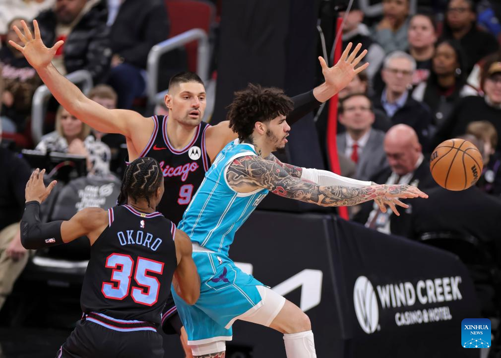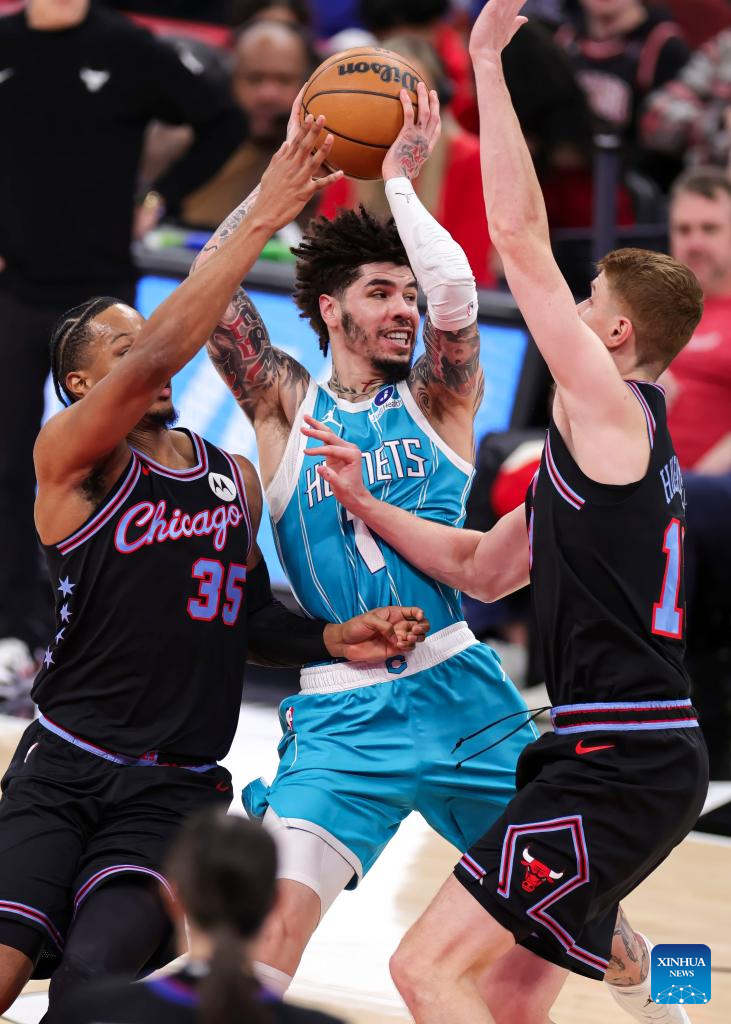 Charlotte Hornets’ Lamelo Ball (C) looks to pass the ball during an NBA regular season basketball match between Charlotte Hornets and Chicago Bulls at United Center in Chicago, U.S. state of Illinois, on Jan. 3, 2026. (Photo by Joel Lerner/Xinhua)