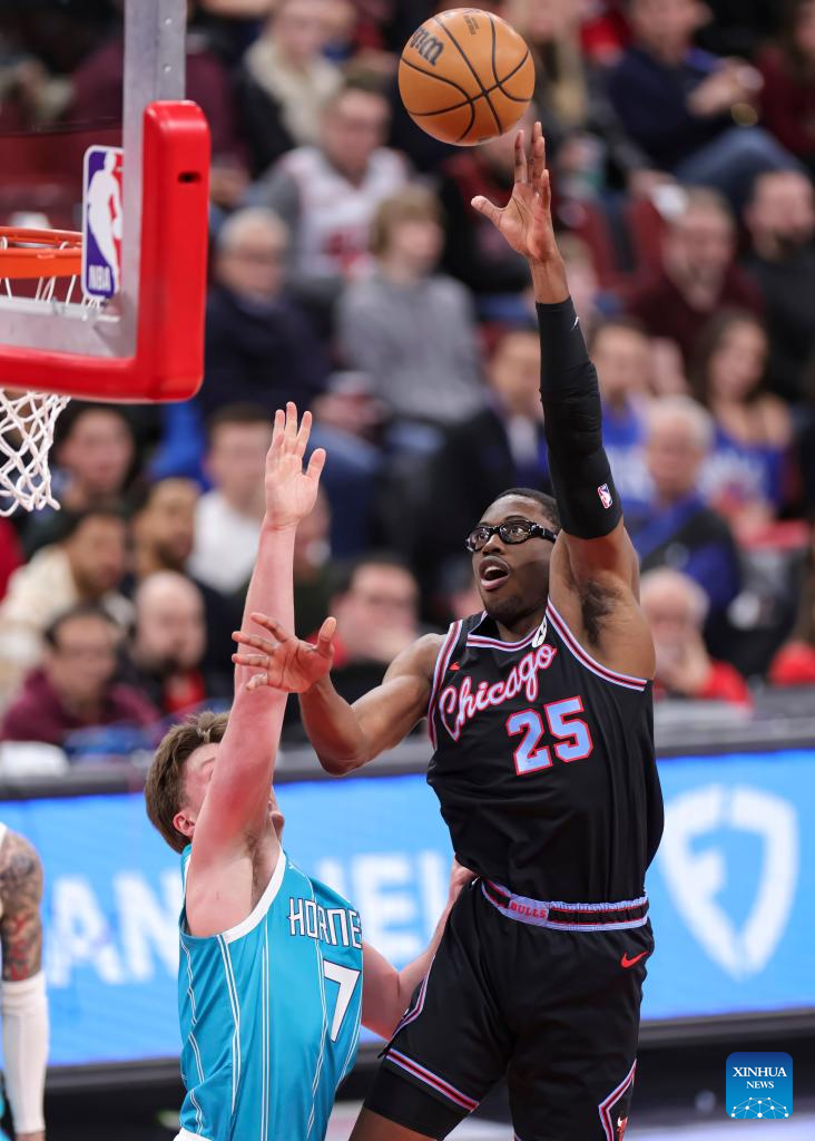 Chicago Bulls’ Jalen Smith (R) shoots the ball during an NBA regular season basketball match between Charlotte Hornets and Chicago Bulls at United Center in Chicago, U.S. state of Illinois, on Jan. 3, 2026. (Photo by Joel Lerner/Xinhua)
