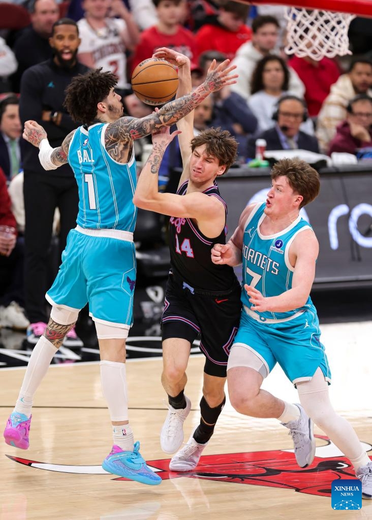 Chicago Bulls’ Matas Buzelis (C) drives between Charlotte Hornets’ Lamelo Ball (L) and Kon Knueppel during an NBA regular season basketball match between Charlotte Hornets and Chicago Bulls at United Center in Chicago, U.S. state of Illinois, on Jan. 3, 2026. (Photo by Joel Lerner/Xinhua)