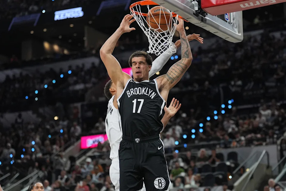 Oct. 26: The Brooklyn Nets’ Michael Porter Jr. dunks in front of the San Antonio Spurs’ Victor Wembanyama at Frost Bank Center.