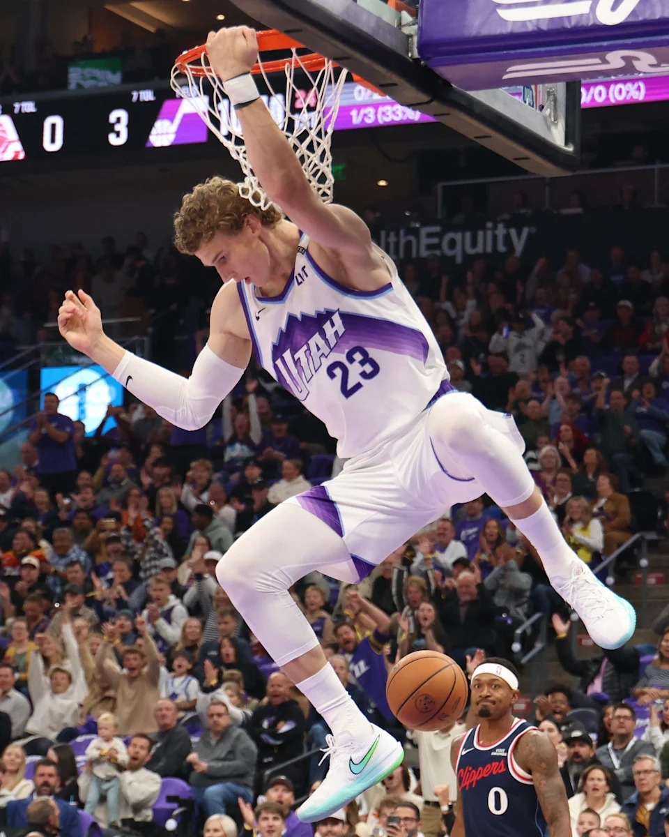 Oct. 22: The Utah Jazz’s Lauri Markkanen dunks against the Los Angeles Clippers at Delta Center.