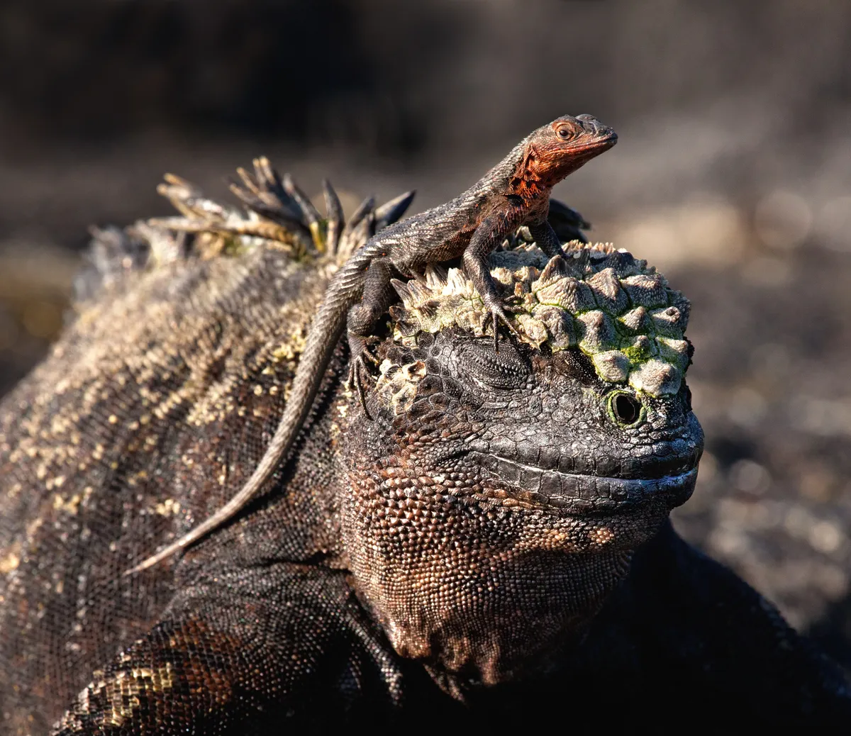A marine iguana basks in the sunshine, with a lava lizard on its head. June Jacobsen