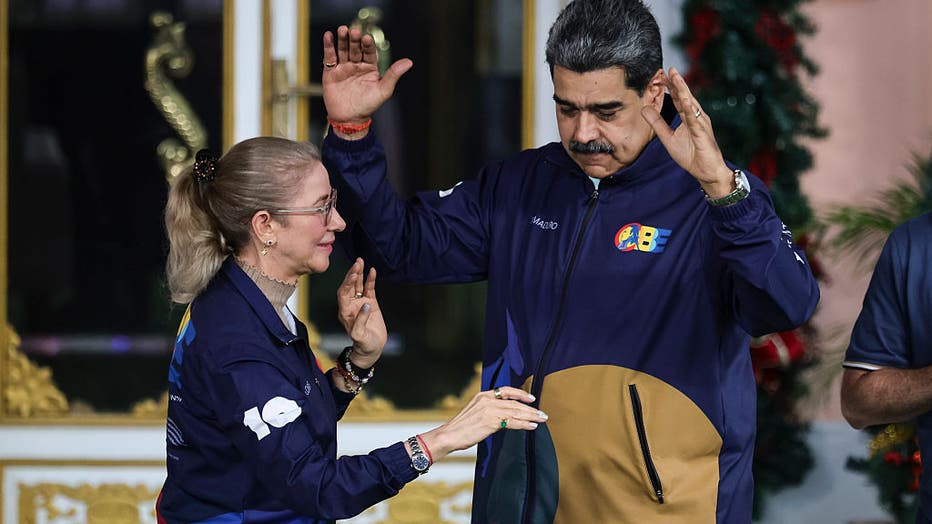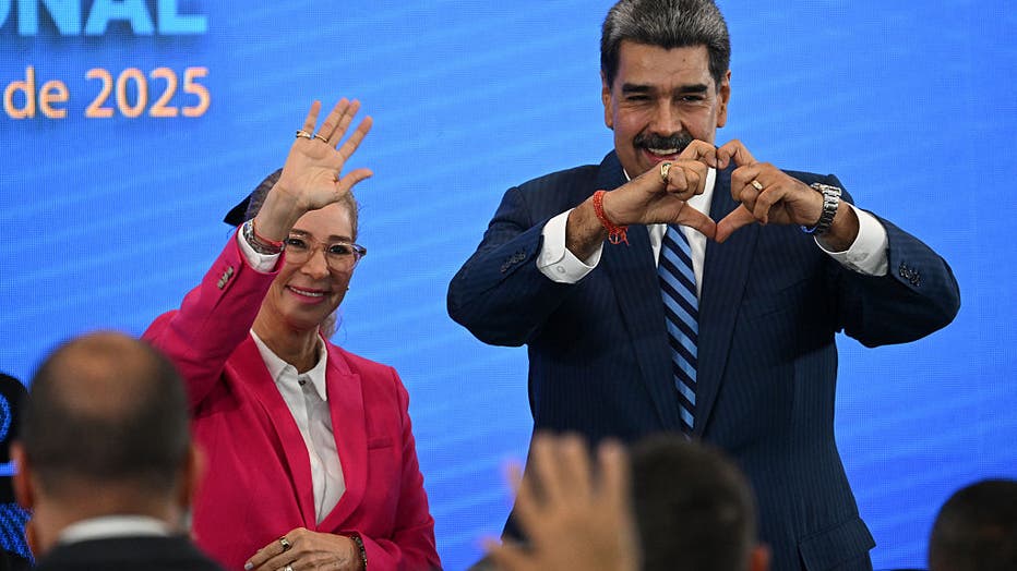 Venezuela’s President Nicolas Maduro (R) makes a heart shape with his hands next to First Lady Cilia Flores during the Meeting of Jurists in Defense of International Law at the Eurobuilding Hotel in Caracas on November 14, 2025. (Photo by Federico PA