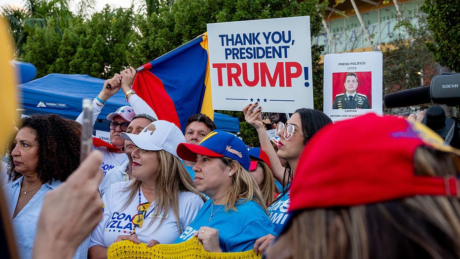 A resident holds a “Thank You President Trump” sign during a celebration at El Arepazo in Doral, Florida, US, on Sunday, Jan. 4, 2026. US President Donald Trump said the US needs “total access” to Venezuela as questions mount about the country’s lead