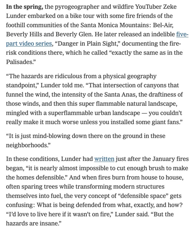 As the anniversary of the LA Fires approach, a lot of us are still asking: WHY? Our film series, DANGER IN PLAIN SIGHT, takes fire experts into LA to ask the same questions. In May of 2025, Zeke and fellow fire experts spent a week on e-bikes in Los Angeles, looking at the recently-burned areas and exploring wildfire-prone neighborhoods. They were there to try to make sense of the recent LA fires, and to share lessons we’ve learned across several careers spent working on large fires in California.