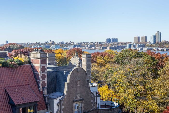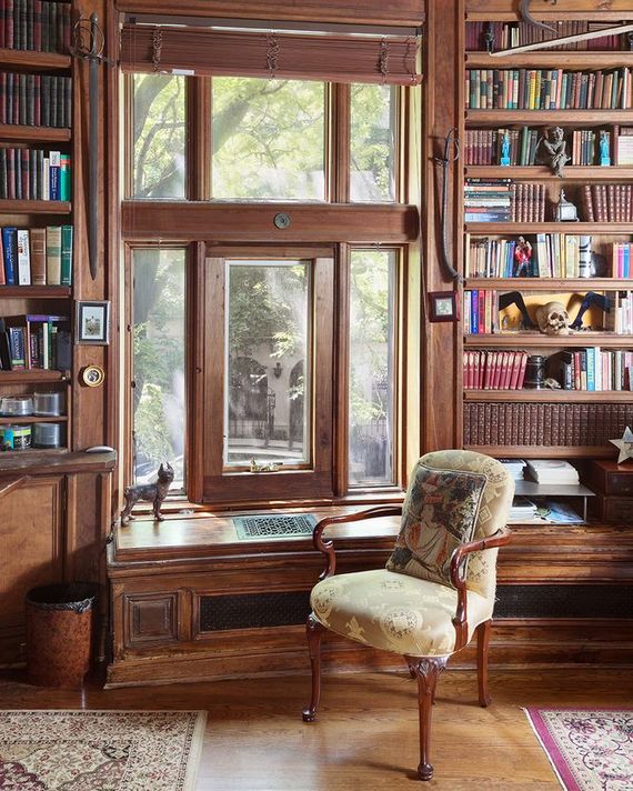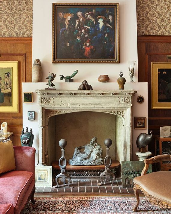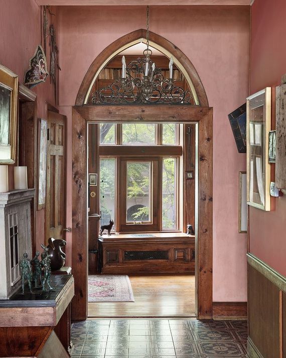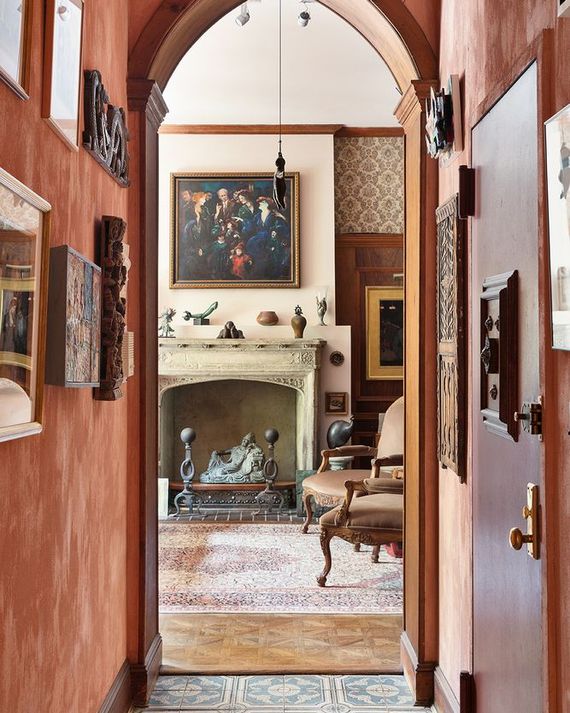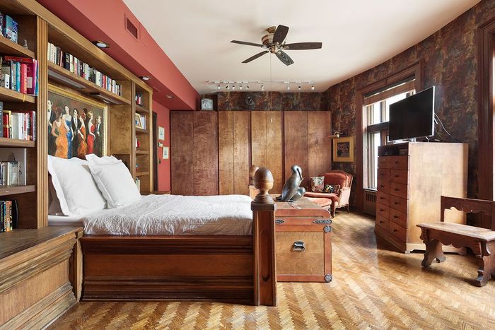 If renters stayed for years and years, that might have been due to their atypically generous landlords. Bill fixed up the roof to create a communal deck and garden with views over the river. The cellar included an art studio open to all. And hallways held the overflow of the couple’s personal collection, which included some Kiki Smiths. “We had art going up the whole six floors. The whole place was a gallery,” says Donna. But the showstopper was their personal home: a 3,000-square-foot two-bedroom apartment that revealed the true extent of Bill’s castle fantasy. They added parquet floors (by hand), put Gothic arches over doorways, and built out the primary bedroom with dark-wood shelving that made it feel more like a monk’s study than Bill’s office, which had views over leafy 80th Street. A panel in a wood-walled double-height living room popped open to reveal a secret cocktail bar, and curved terra-cotta roof tiles were built into the wall of the dining room to create an improvised wine rack. When they came up with the idea of concealing an airshaft with stained glass, Donna took a class at the YMCA and installed the glass herself. The staircase beside it is Bill’s ode to Donna; he wanted something grand enough for her to make an entrance. The couple decorated with period wallpaper and dark curtains, but they didn’t have Gilded Age sensibilities, and parties often included the renters. “All of our tenants were friends,” says Donna. “People were in and out my door constantly. The building was full of life.” Mark Jovanovic, a real-estate agent, started helping rent the units around 2005 and couldn’t turn down an invitation to Bill and Donna’s duplex. “After a showing, I would dedicate 40 minutes just to hear their stories,” he says.