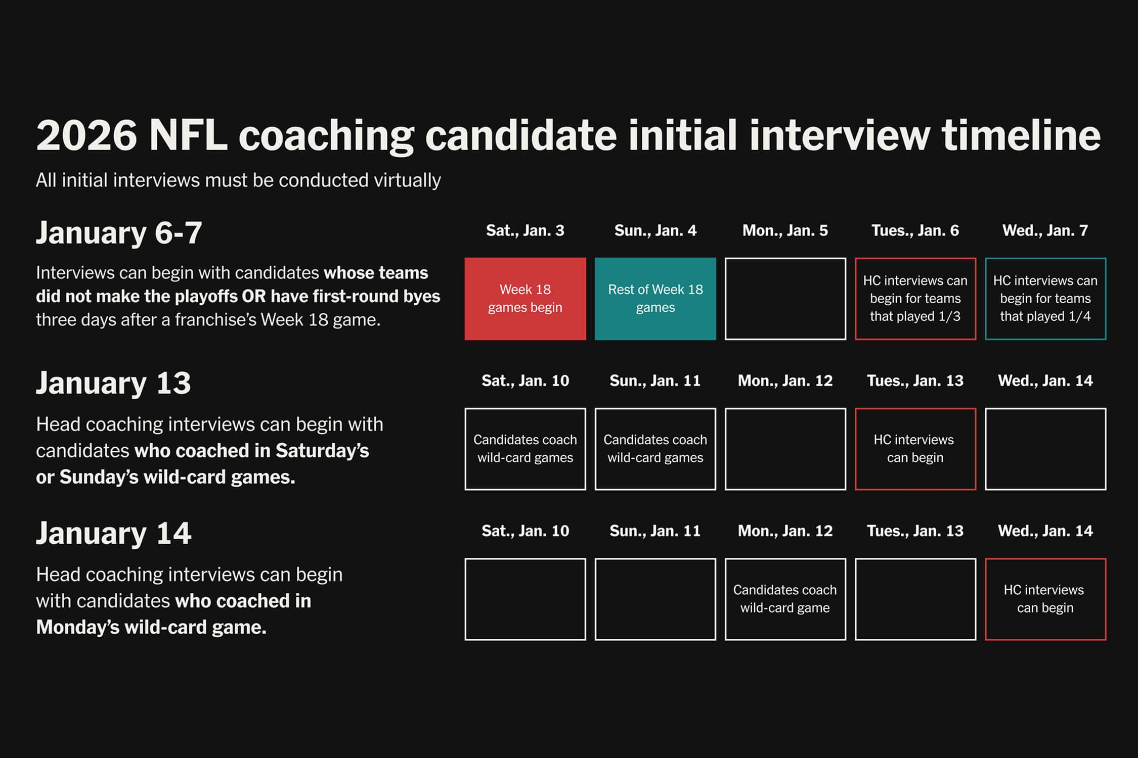 A coach whose team has already been eliminated from the postseason cannot participate in virtual interviews until three days after their team’s Week 18 season finale. A coach whose team is in the playoffs but received a wild-card bye can also begin participating in virtual interviews three days after their Week 18 game, but all such meetings must be completed before the wild-card games conclude.
