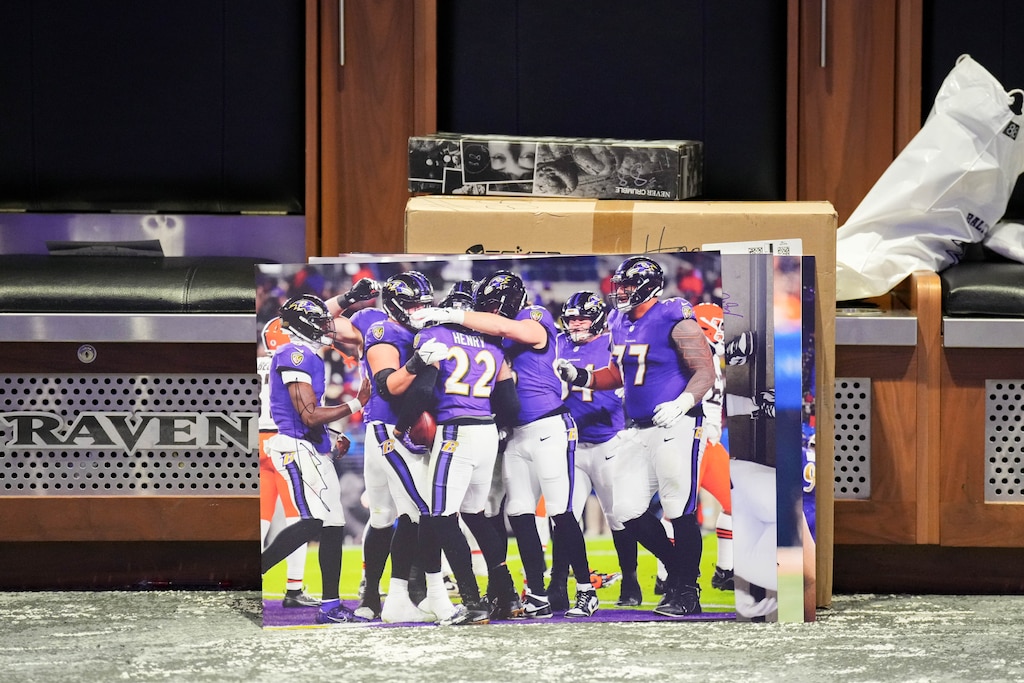 A poster board of one of Baltimore Ravens running back Derrick Henry’s touchdowns on the floor during the team’s end-of-season locker room clean-out on Monday. (Ulysses Muñoz/The Banner)