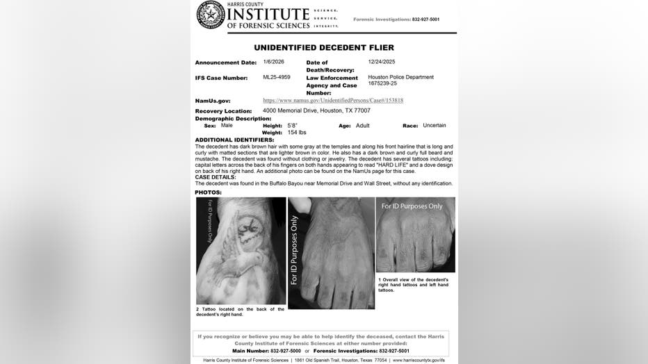 The Harris County Institute of Forensic Sciences released a description of the man and photos of his tattoos, in hopes someone can help identify him.