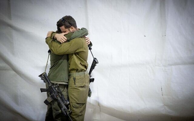 IDF soldiers embrace at the funeral of reservist Tzvika Lavi at the Mount Herzl Military Cemetery in Jerusalem, December 12, 2023. (Yonatan Sindel/Flash90)