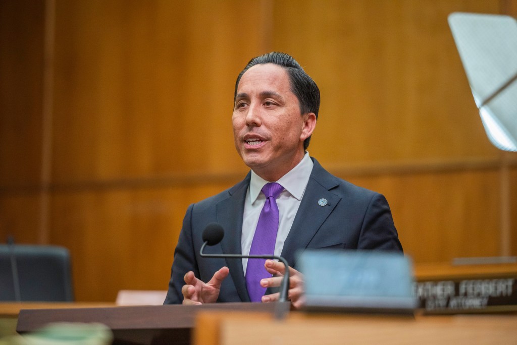 San Diego Mayor Todd Gloria delivers his State of the City address on the 12th floor of the City Administration Building in downtown San Diego on Jan. 15, 2025. / Photo by Vito di Stefano for Voice of San Diego