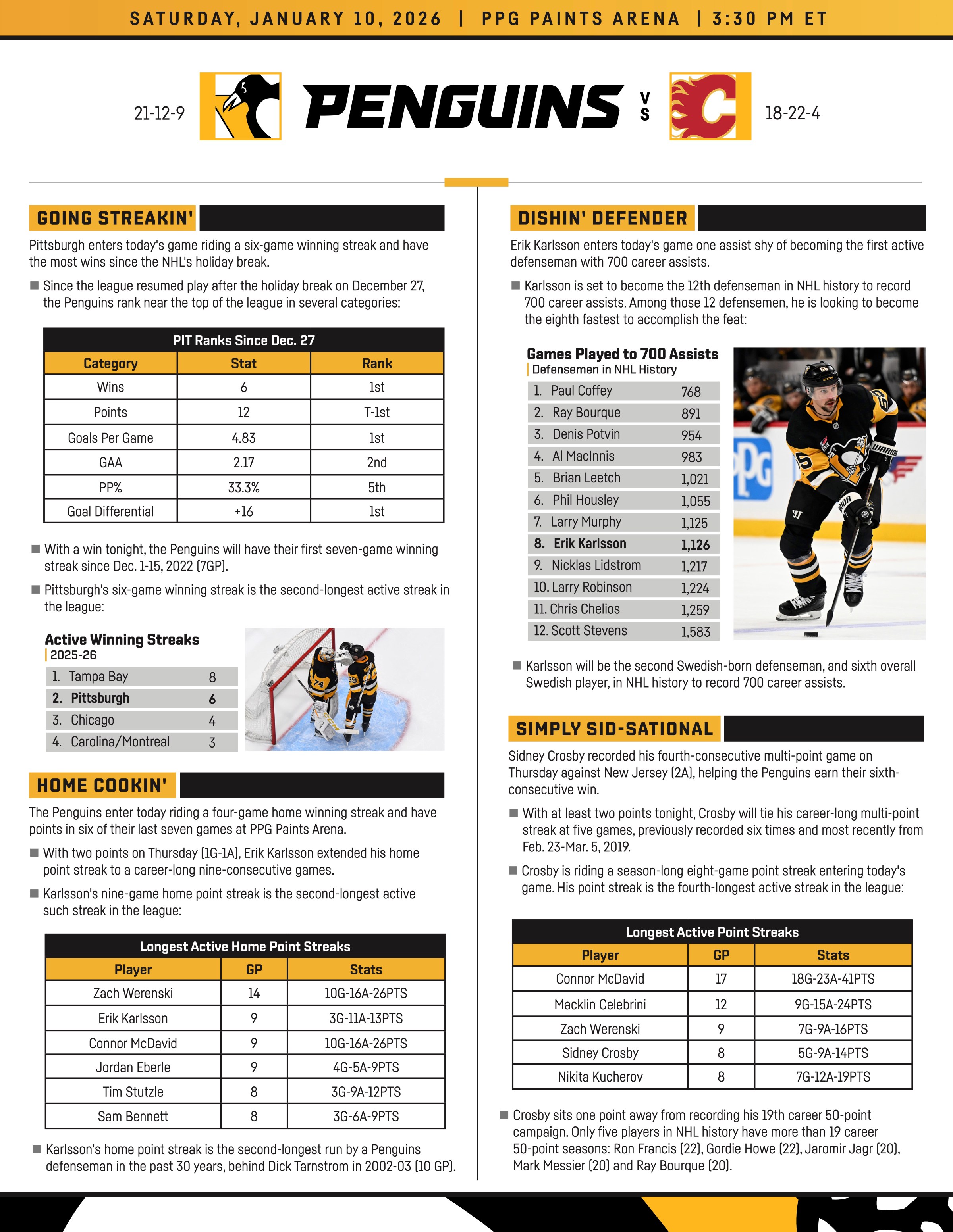 Season Series: This is the first time the Flames and Pens have met this season. They’ll see one another later this month, when the Pens head to Calgary on Jan. 21 as part of a four-game West Coast road swing.