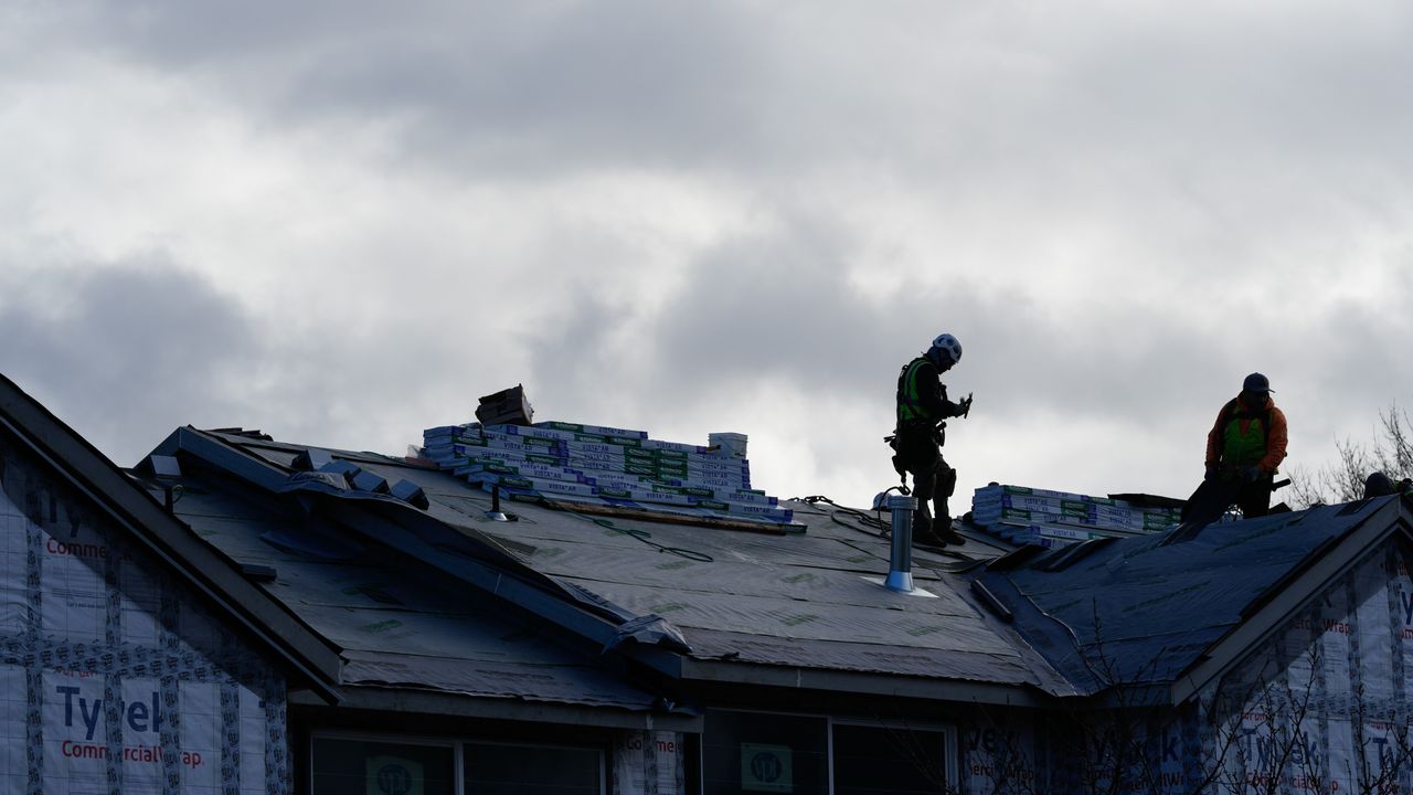 Construction workers stand on the roof of a buildling as they work on Dec. 12, 2025, in Hillsboro, Oregon. [AP Photo/Jenny Kane]