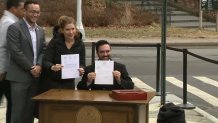 The mayor appeared on 12th Avenue and St. Clair Place in West Harlem. He and New York City Council Speaker Julie Menin signed final approvals for the city’s Department of Transportation to install a new public bathroom at that location later this year.