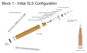 NASA’s Space Launch System rocket inside high bay 3 of the Vehicle Assembly Building at Kennedy Space Center waiting for the Artemis II crew to arrive to board their Orion spacecraft atop the rocket as part of the countdown demonstration test, Dec. 20, 2025. The orange segment is the Core Stage of the SLS rocket (Boeing) powered by Aerojet Rocketdyne (an L3Harris company) RS-25 engines. Three originally flew on the Space Shuttle and one is new. The two white “strap ons” on either side are Solid Rocket Motors (Northrop Grumman). Photo Credit: (NASA/Joel Kowsky) Not shown is the Interim Cryogenic Propulsion Stage (United Launch Alliance) that sits between SLS and Orion (see illustration below).