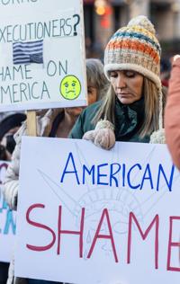 A woman frowns, looking down as she holds a sign that reads American shame.