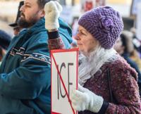 Fort Worth resident Laura Anderson, 50, looks down as she listens to speakers during a protest against U.S. Immigration and Customs Enforcement on Jan. 10 at the General Worth Square in Fort Worth. Anderson said it was her responsibility, as a person, to stand up for and protect one another.