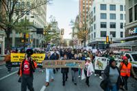 Protesters march down a street, people in front carrying banners.