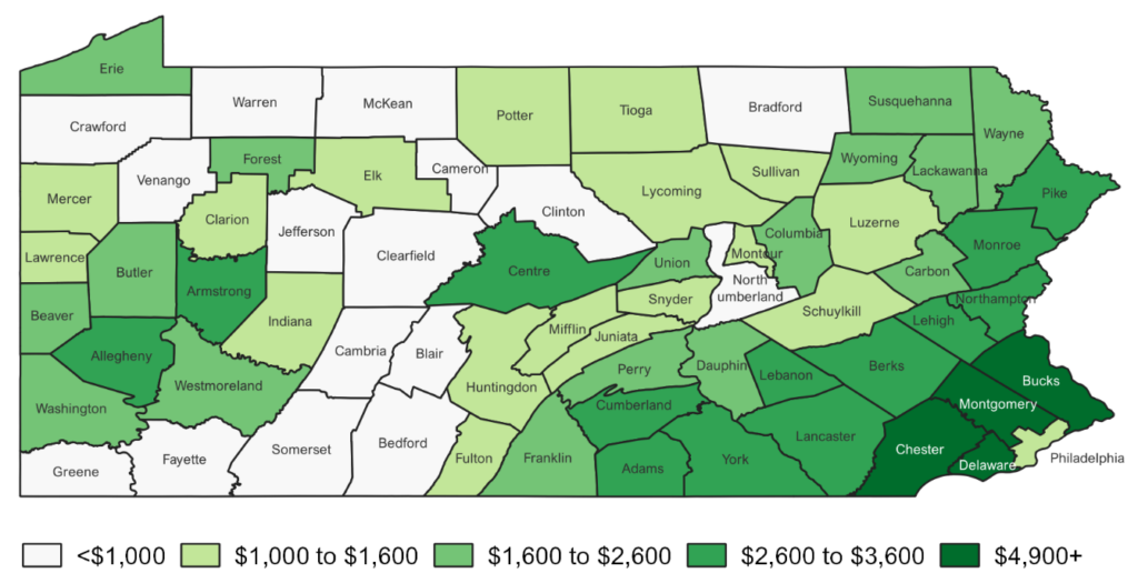 The map below shows the median school tax for all counties across the state. The “bleed” of high tax rates appears to be spreading from the southeast to adjacent counties, with the exception of Centre County in the center of the state and Allegheny and Armstrong Counties in the Western region.