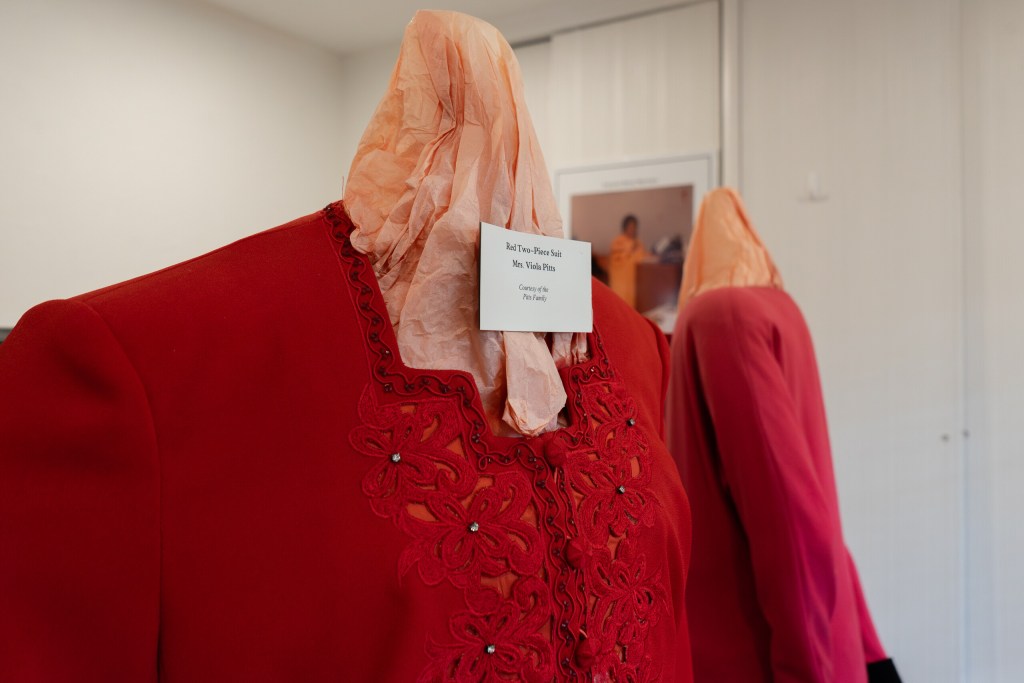 A red dress previously worn by Viola Pitts is on display at Renaissance House on Dec. 16. Pitts was a Fort Worth civil rights activist who died in 2004. (David Moreno | Fort Worth Report)