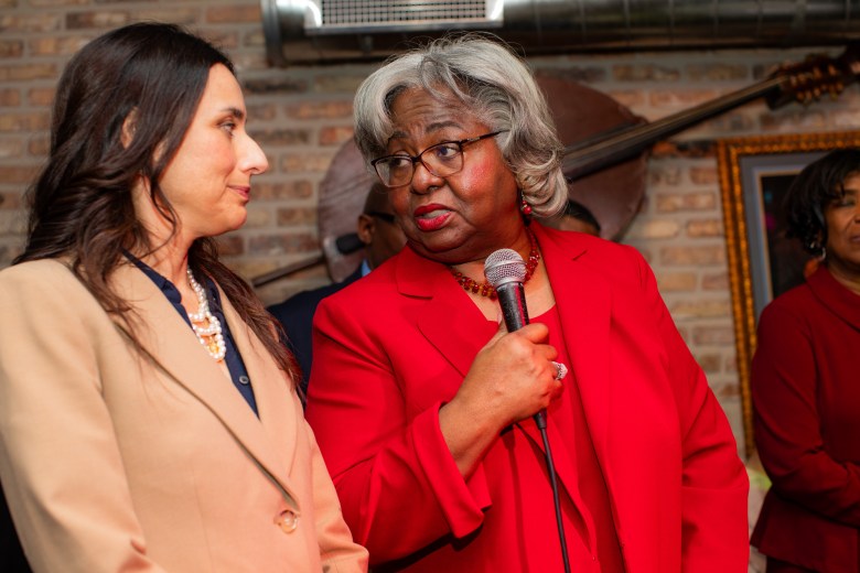 Texas Rep. Barbara Gervin-Hawkins introduces gubernatorial hopeful Gina Hinojosa during Jasmine Crockett’s campaign stop. Credit: Vincent Reyna for the San Antonio Report