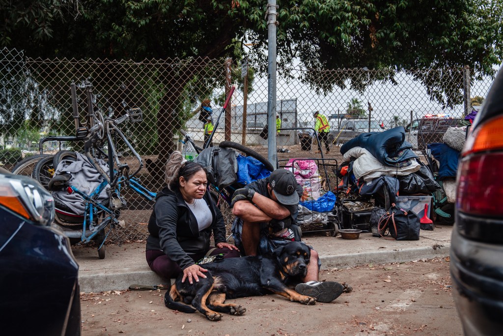 Natalio Avina and Fawnadina Hunter with their dog sit near what was once an encampment outside of downtown San Diego on Oct. 15, 2024. / Photo by Ariana Drehsler