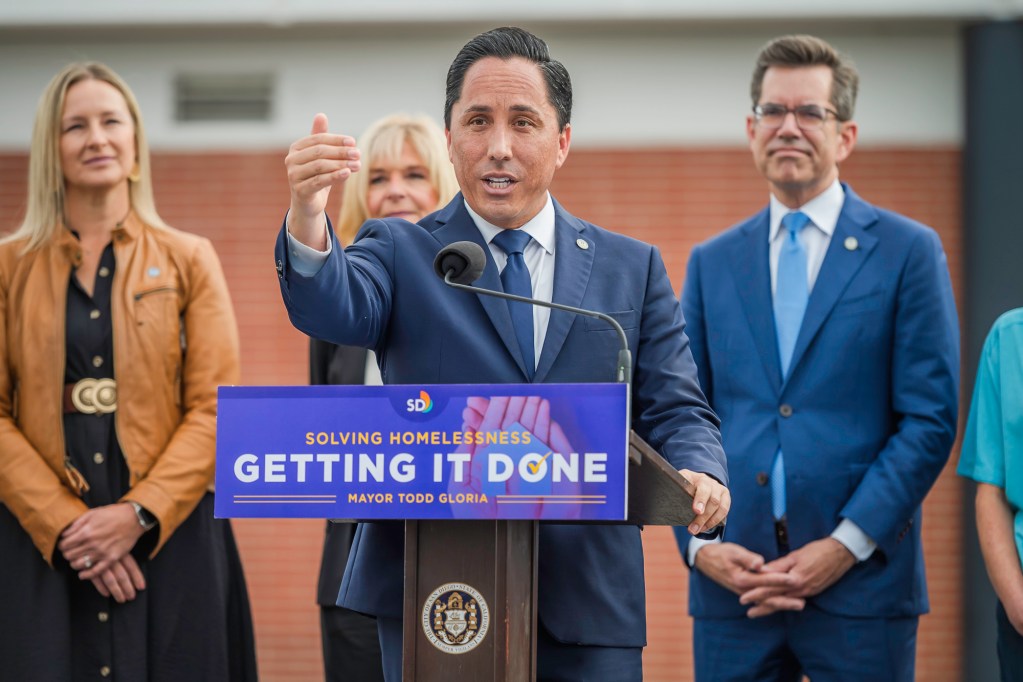 San Diego Mayor Todd Gloria announced his proposal to lease and transform a vacant warehouse into a 1,000-bed homeless shelter in April 2024. / Photo by Vito di Stefano for Voice of San Diego