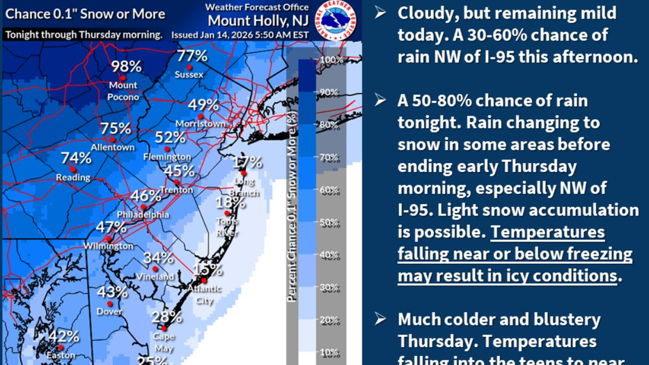 A mix of snow and rain is expected to fall early Thursday morning, creating slippery conditions for commuters.