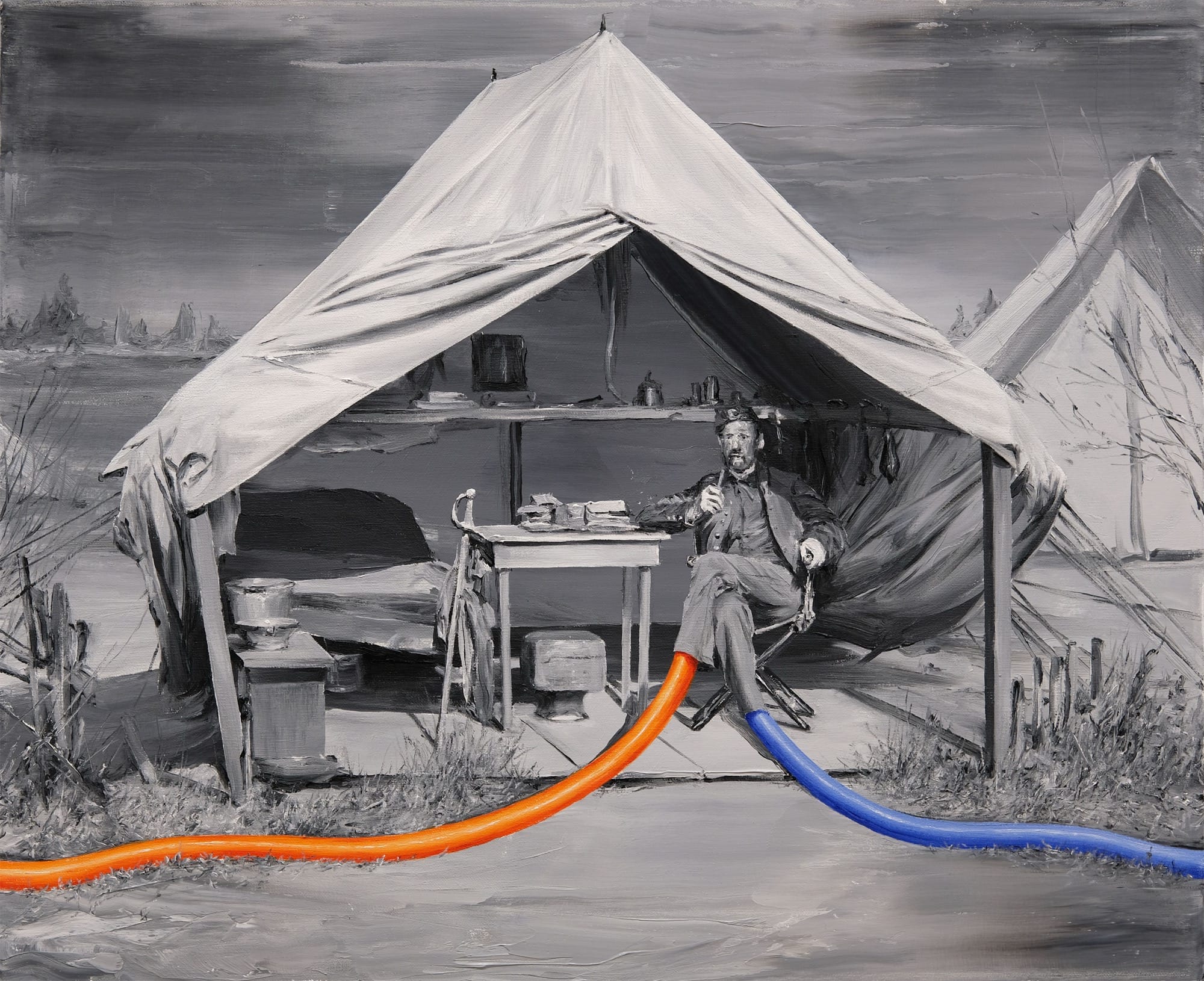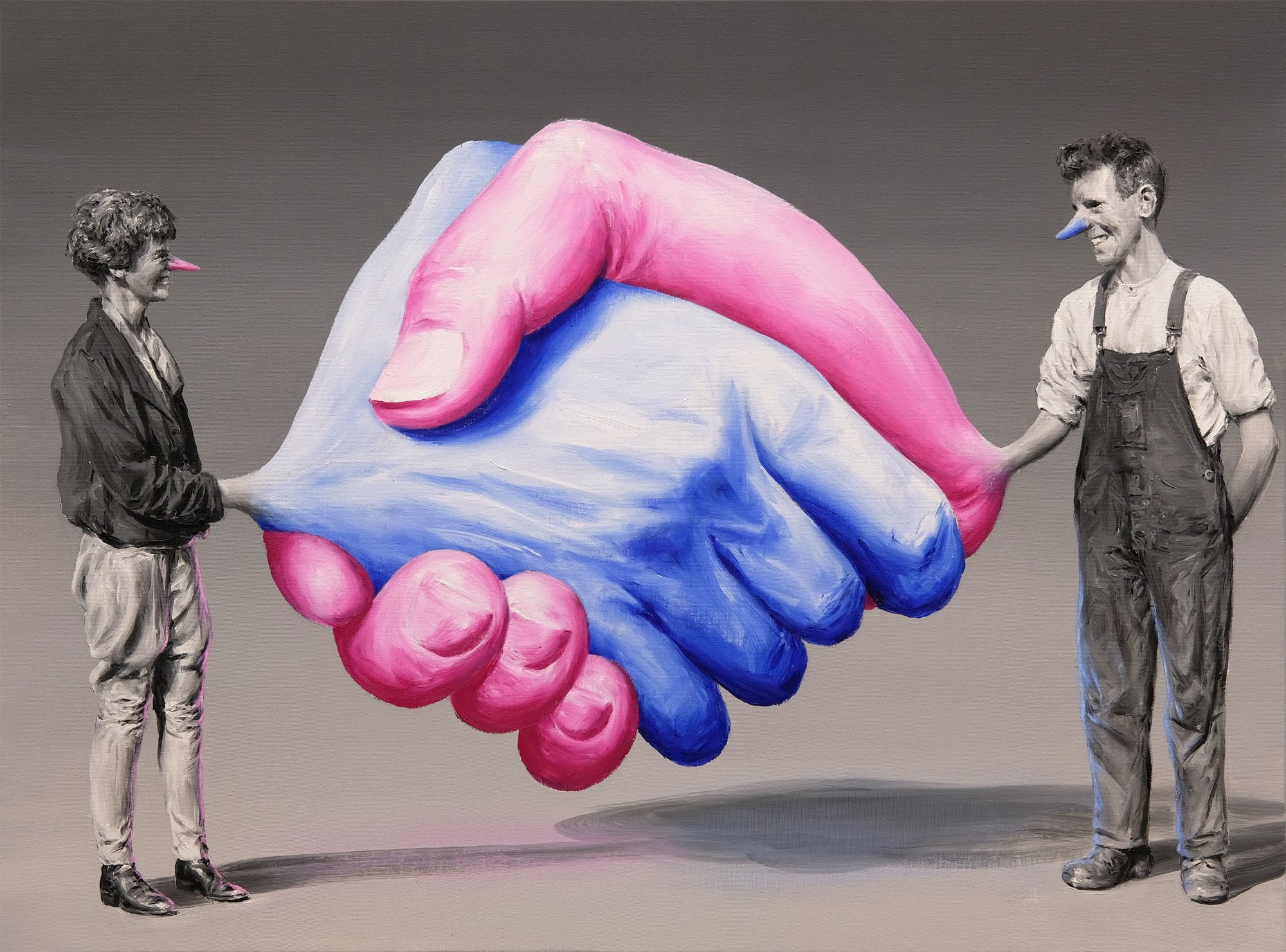 From figures with multiple legs and noodles for arms to frolicking trees, Paco Pomet summons the absurd. Known for his uncanny oil paintings rendered mostly in monochrome and enlivened by colorful details of overly stretchy limbs or celestial objects, a sense of nostalgia greets surreal scenarios. The artist often derives his imagery from vintage black-and-white photographs, adding an absurd dimension to history.