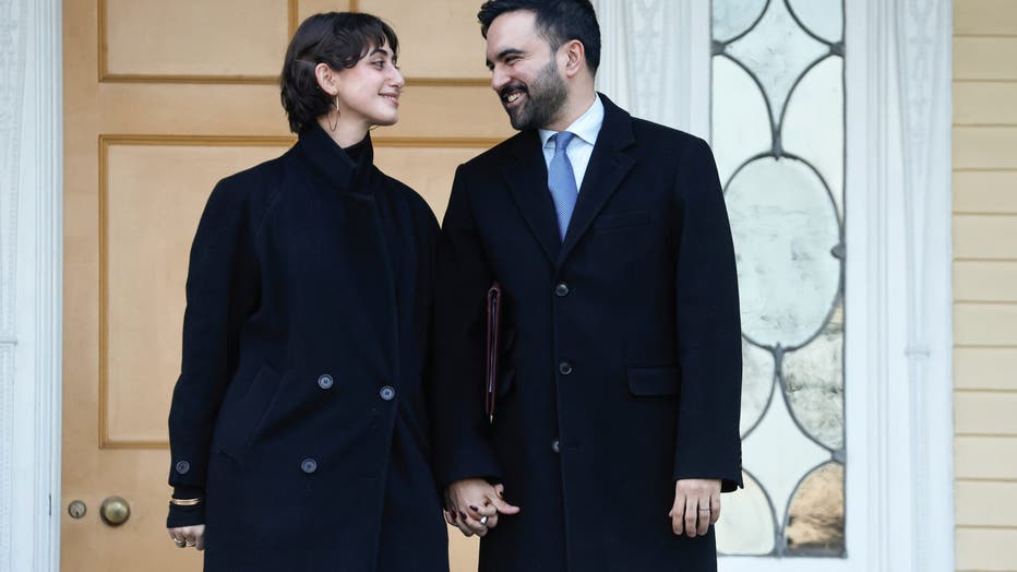 Zohran Mamdani, mayor of New York, and his wife Rama Duwaji during a news conference at Gracie Mansion in New York, US, on Monday, Jan. 12, 2026. Mamdani held his first news conference from Gracie Mansion on Monday, after moving into the official may