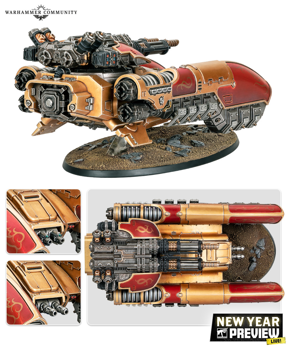 Equipped as it is with a versatile Arachnus blaze carronade (equally capable of busting tank hulls or scything down swathes of heavy infantry)… not to mention the hull-mounted weapons (twin lastrum bolt cannon or a gun-type we’ve never seen before: the twin neutronium cascade projector). Think main battle tank, only better.