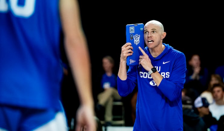 BYU head coach Shawn Olmstead calls out to his players during an NCAA men’s volleyball game against UC San Diego held at the George Albert Smith Fieldhouse in Provo on Friday, Jan. 16, 2026. | Isaac Hale, Deseret News