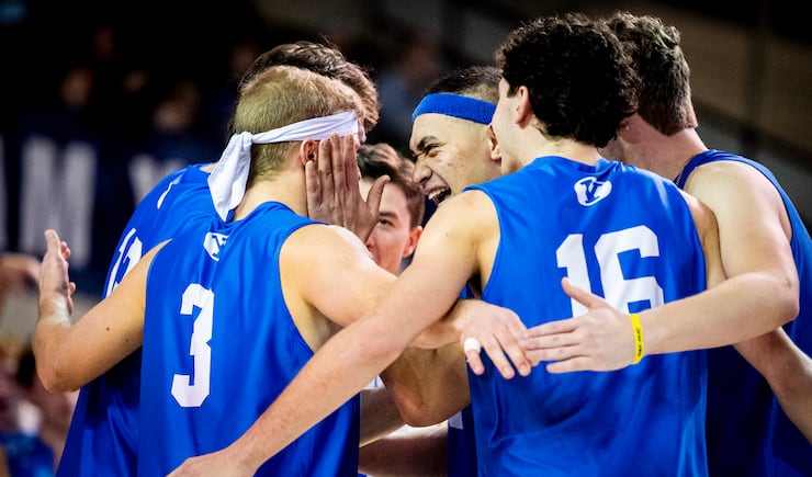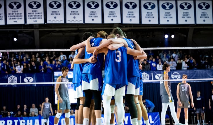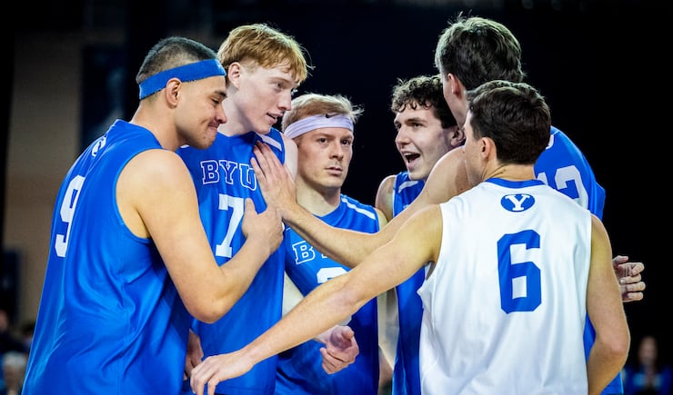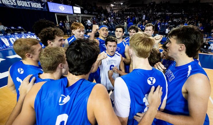 BYU players huddle before an NCAA men’s volleyball game against UC San Diego held at the George Albert Smith Fieldhouse in Provo on Friday, Jan. 16, 2026. | Isaac Hale, Deseret News