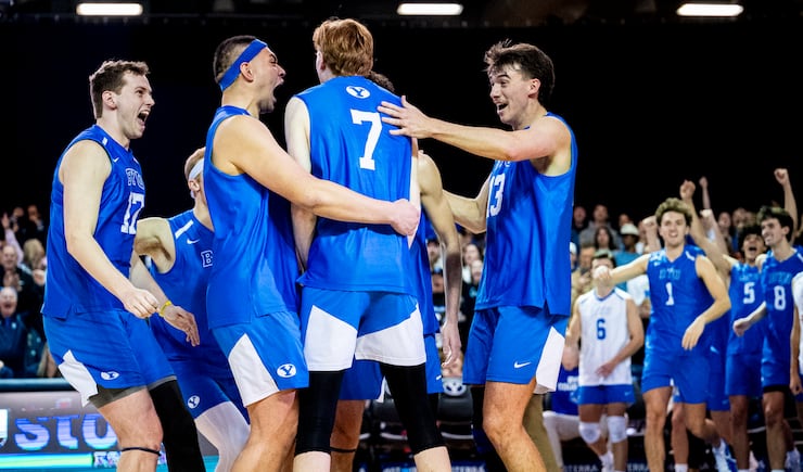 BYU players celebrate around middle blocker AJ Cottle (7) after a point against UC San Diego during an NCAA men’s volleyball game held at the George Albert Smith Fieldhouse in Provo on Friday, Jan. 16, 2026. | Isaac Hale, Deseret News