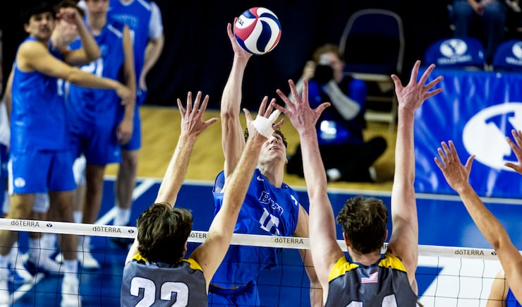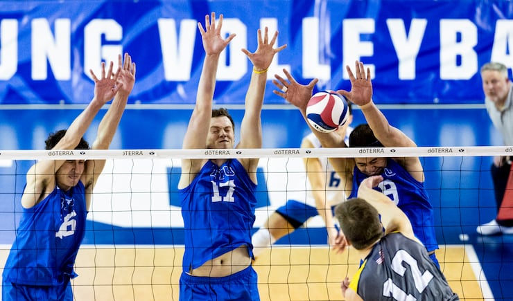 From left, BYU outside hitter Connor Oldani (16), middle blocker Gavin Chambers (17) and outside hitter Teilon-Jonathan Tufuga (9) look to block a hit from UC San Diego outside hitter Josh Ewert (12) during an NCAA men’s volleyball game held at the George Albert Smith Fieldhouse in Provo on Friday, Jan. 16, 2026. | Isaac Hale, Deseret News