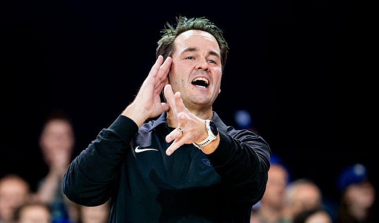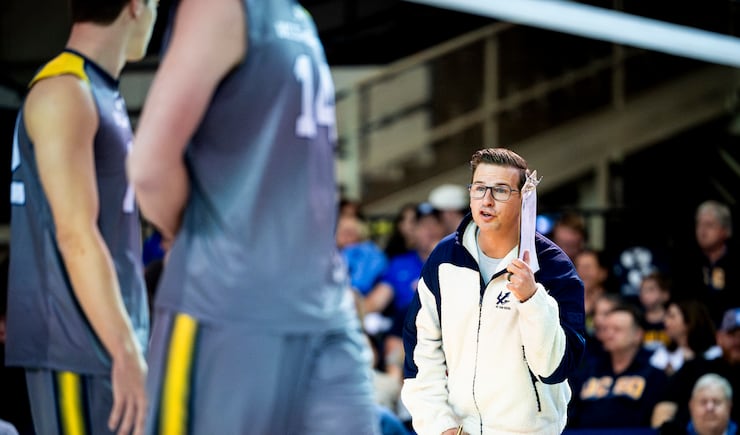 UC San Diego head coach Brad Rostratter calls out to his players during an NCAA men’s volleyball game against BYU held at the George Albert Smith Fieldhouse in Provo on Friday, Jan. 16, 2026. | Isaac Hale, Deseret News