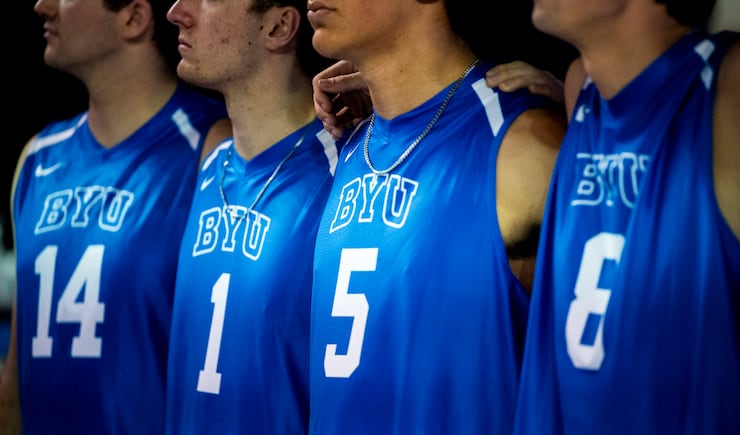 BYU players stand as opening lineups are announced before an NCAA men’s volleyball game against UC San Diego held at the George Albert Smith Fieldhouse in Provo on Friday, Jan. 16, 2026. | Isaac Hale, Deseret News